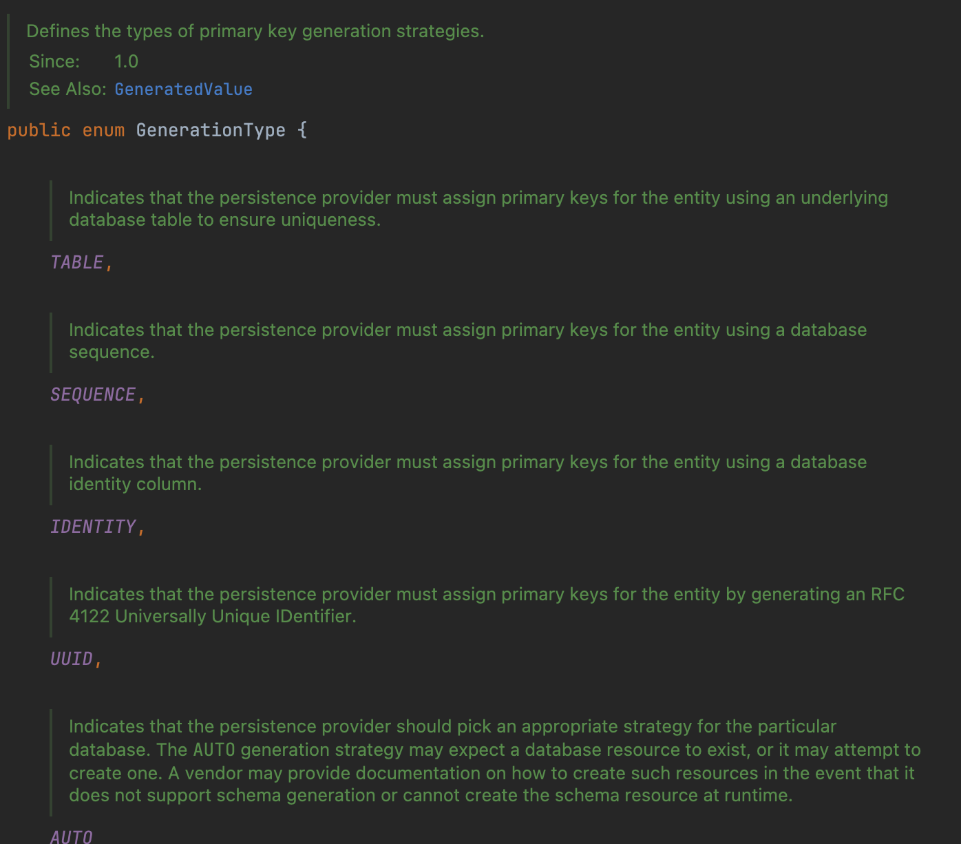 ㅇ JPA(Java Persistence API)에서 엔티티의 기본 키 생성 전략을 정의하는 데 사용되는 GenerationType에 대해 알아보자.