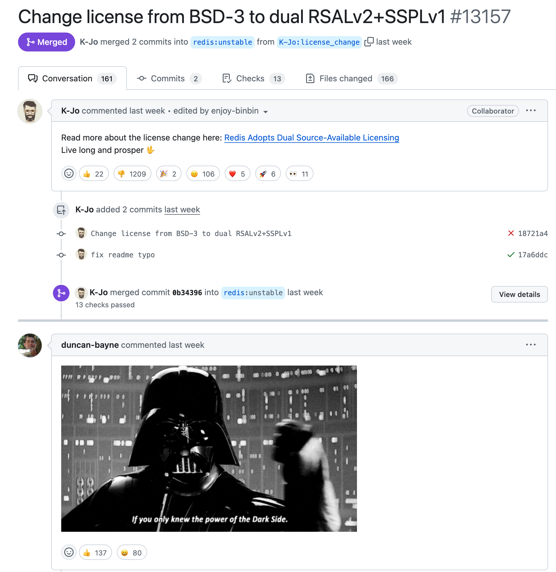 사람들의 반응은 부정적이다. K-JO가 커밋하면서 Live long and prosper 🖖 라는 메시지를 남겼는데, 번역하면 장수하라는 말인데... 오픈소스를 제약하면서 번영을 어떻게 하라는 말인지??? 사람들은 다스베이터의 밈을 남기며, 오픈 소스의 이상을 저버리고 이익 추구하는 움직임에 부정적인 의견을 남기고 있다.