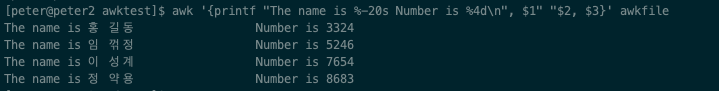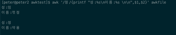 > awk '/정/{printf "성:%s\n이름:%s \n\n",$1,$2}' awkfile