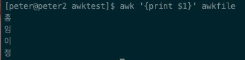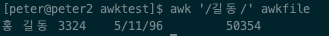 > awk -F: '/홍/{print $1, $2}' awkfile_F