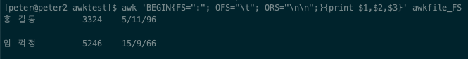 awk의 빌트인 변수 FS는 입력 필드 분리자의 값을 가지고 있습니다. FS의 디폴트값으로 공백과 탬이입니다. FS 값은 -F를 사용하여 변경함.