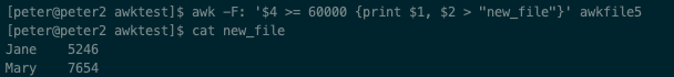 > awk -F: '$4 >= 60000 {print $1, $2 > "new_file"}' awkfile5