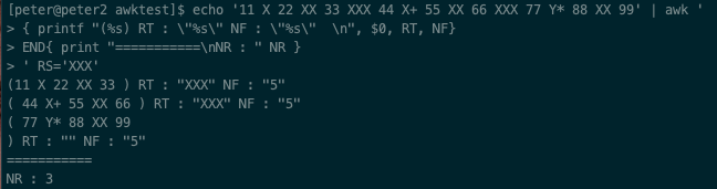 첫 번째 예는 RS='XXX' 로 설정한 경우입니다. 입력되는 데이터에 'XXX' 가 두 개 있으므로 레코드가 세 개로 분리되고 이때 RT 값은 동일하게 'XXX' 설정되는 것을 볼 수 있습니다.