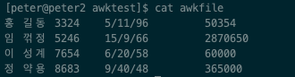 1) 먼저 awk는 파일 또는 파이프를 통해 입력 라인을 얻어와 $0라는 내부 변수에 라인을 입력해 둡니다. 각 라인은 레코드라고 부르고, newline에 의해 구분됩니다.