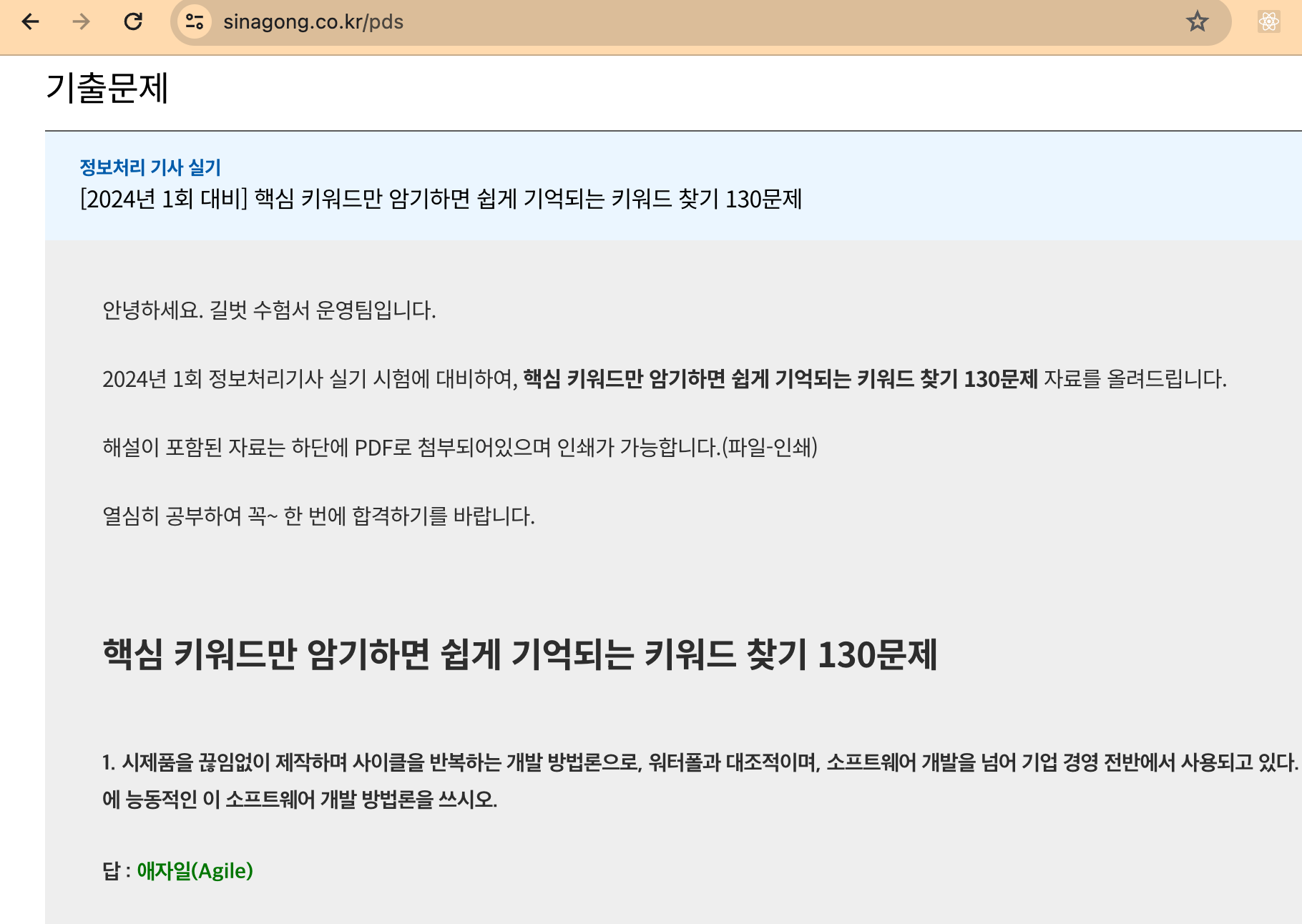 | [정처기 실기] 2024년 실기, 핵심 키워드 130문제 풀이-1 (5) | 2024.04.25 |