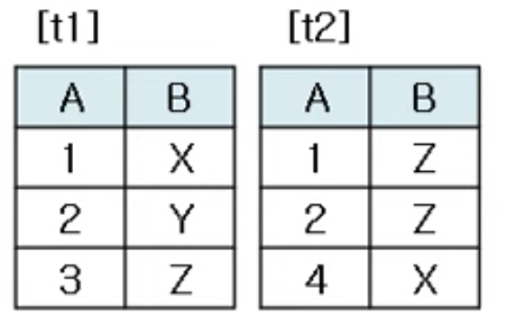 * JOIN (X) : 두 개의 릴레이션 A와 B에서 공통된 속성을 연결하는 것