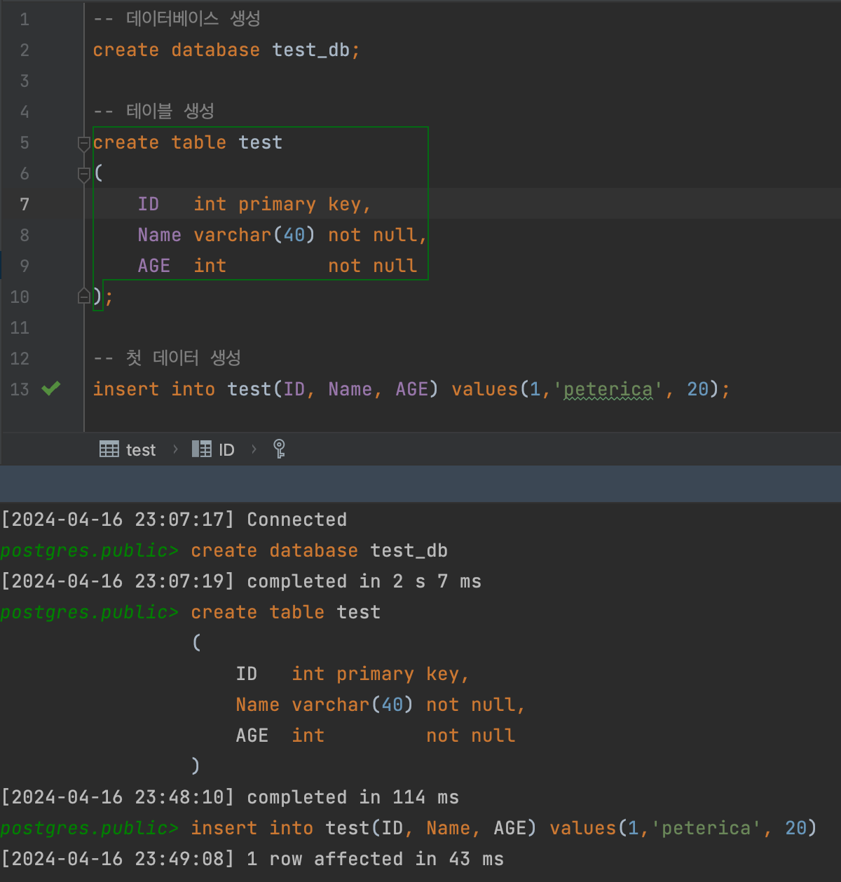 insert into test(ID, Name, AGE) values(1,'peterica', 20);
