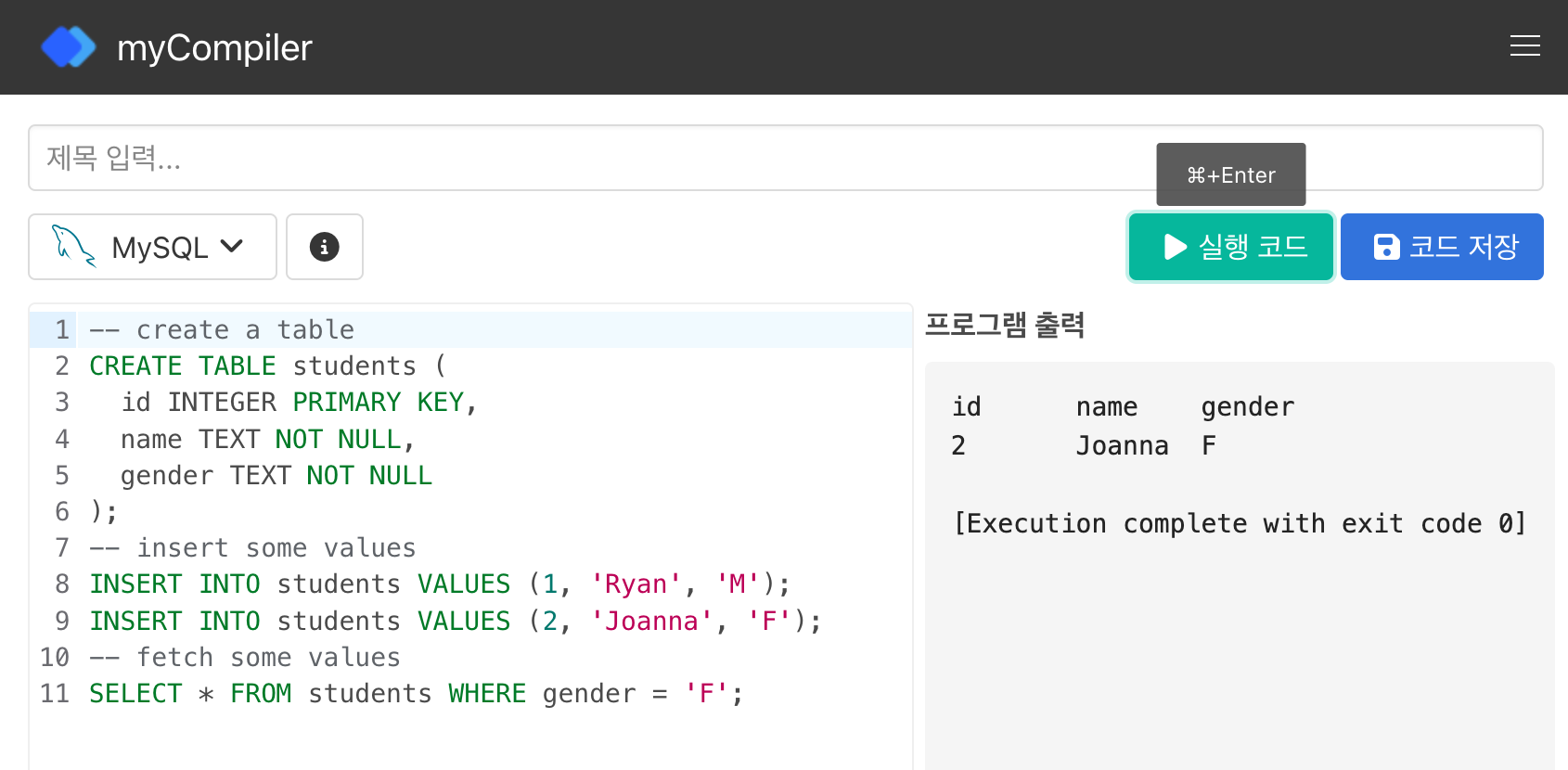 ㅇ 기본적인 Table 생성문과 샘플데이터 생성 및 조회 쿼리가 샘플로 제공된다.