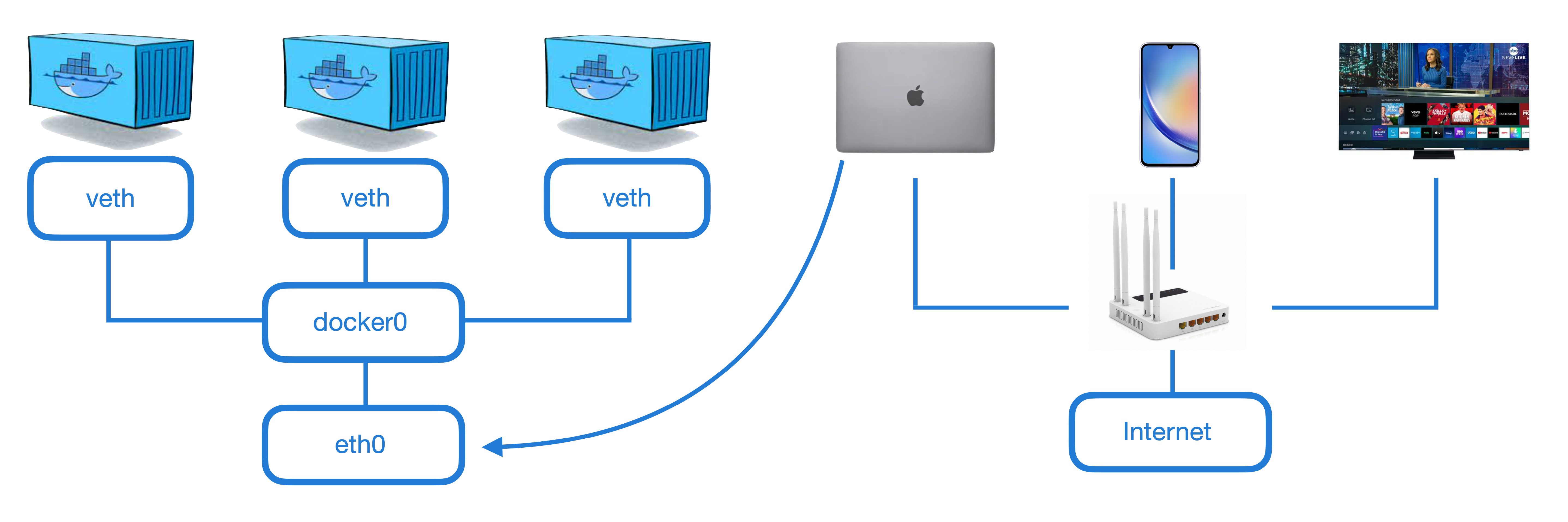 Internet은 공유기를 통해 나의 맥북에 eth0으로 연결되고, eth0는 docker0에 연결되어 Container와 연결된다.
