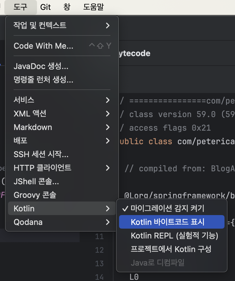 ㅇ 원하는 Kotlin 소스를 선택 후 도구 > Kotlin > 바이트코드표시를 선택한다.