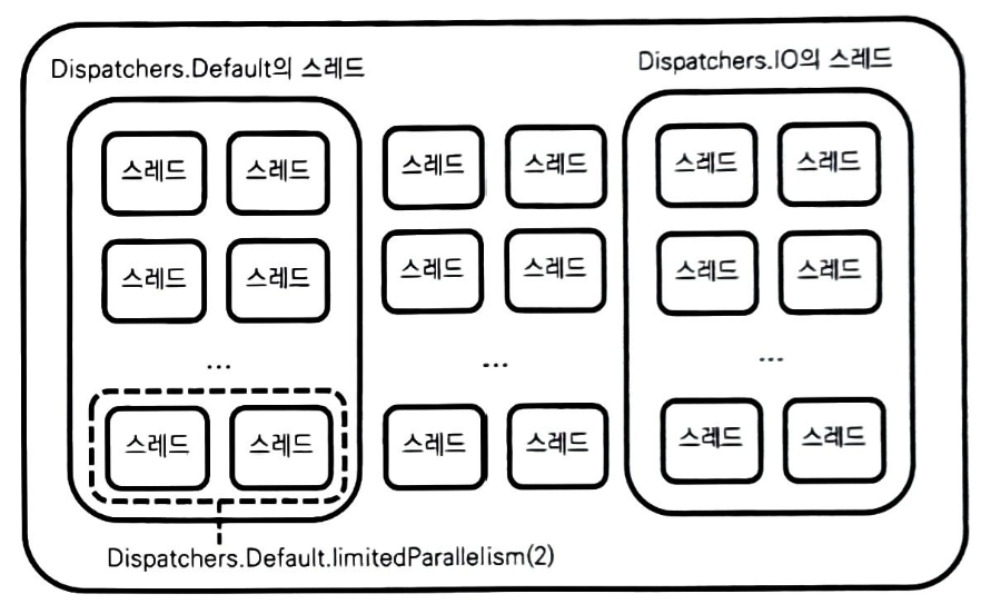 ㅇ limitedParallelism는 Dispatchers.Default의 스레드들의 과점유를 방지하기 위해 일부 스레드만 사용하도록 제한을 둔다.