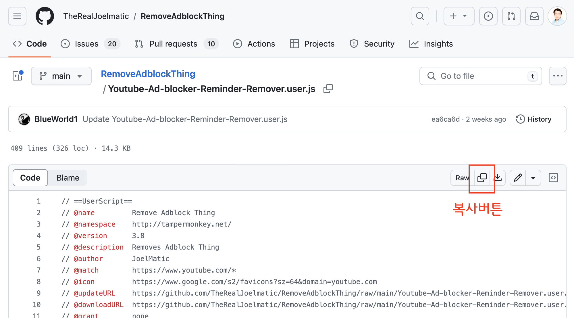 ㅁ 유튜브 광고 제거 스크립트 복사하기