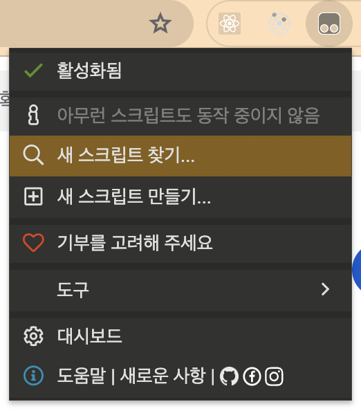 ㅇ 확장 프로그램 아이콘을 클릭하여 새 스크립트 만들기를 실행한다.