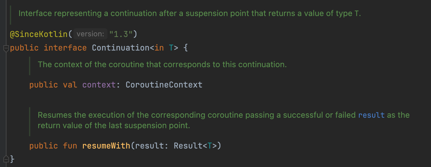 ㅇ 코루틴이 중단되면 Coninuation에 실행정보가 저장되고, continuation.resume을 통해 재개된다.