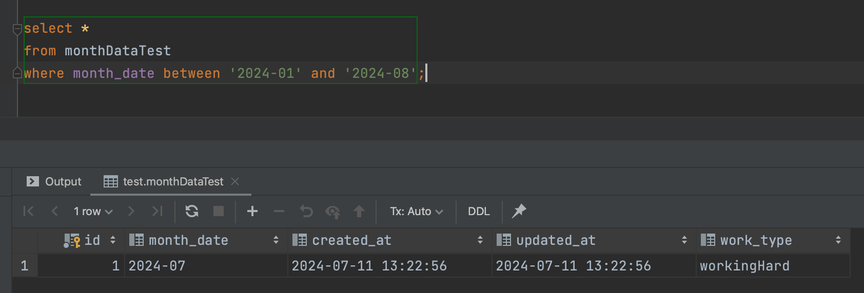 test> insert into monthDataTest (month_date, created_at, updated_at, work_type) value ('2024-07', now(), now(), 'workingHard')