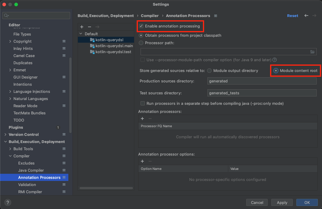 ㄴ "Store generated sources relative to"가 "Module content root"로 설정되어 있는지 확인