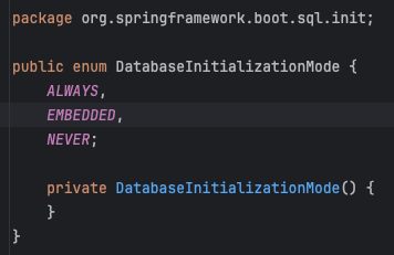 - embedded: 내장형 데이터베이스(예: H2, HSQL, Derby)에만 초기화를 수행한다.