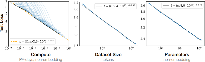 언어 모델의 성능은 위 세 가지 스케일 요소와 멱법칙(power-law) 관계를 가진다.