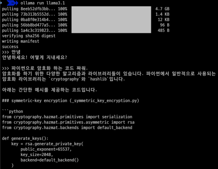 ㅇ 위 명령어를 터미널에서 실행하여 라마 모델을 실행한다.