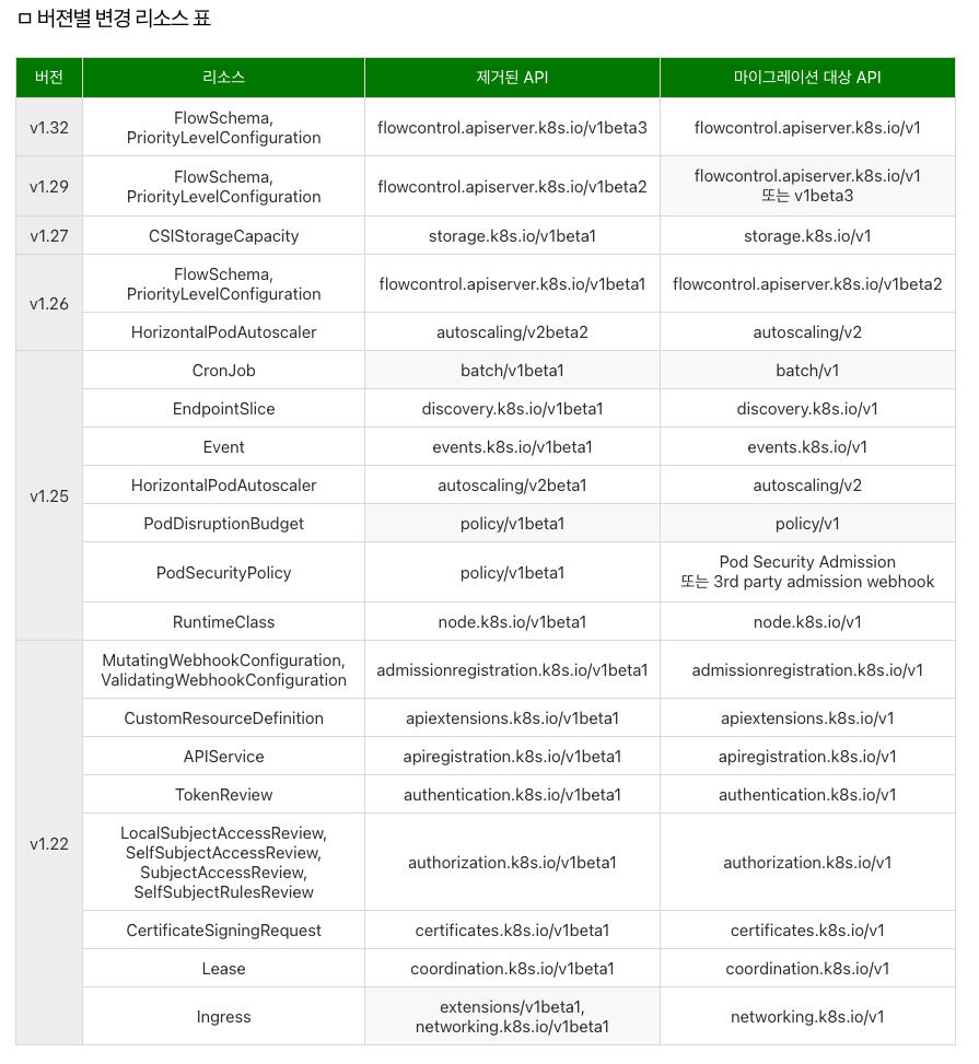 [Kubernetes] 쿠버네티스 API 버전별 제거된 API와 마이그레이션 API요약 표 본문