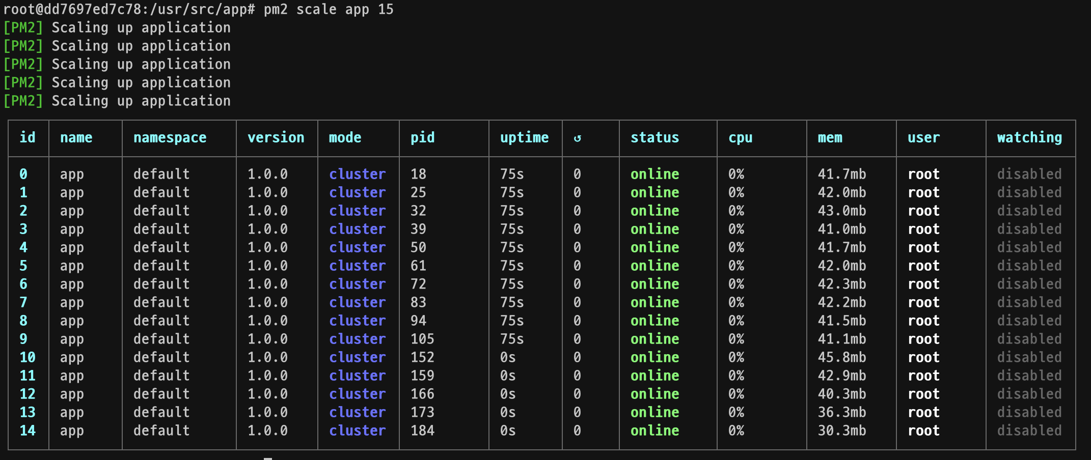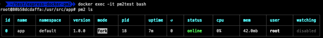 ㅇ Dockerfile의 커멘드로 실행할 경우 pm2의 인스턴스 모드가 fork이다.