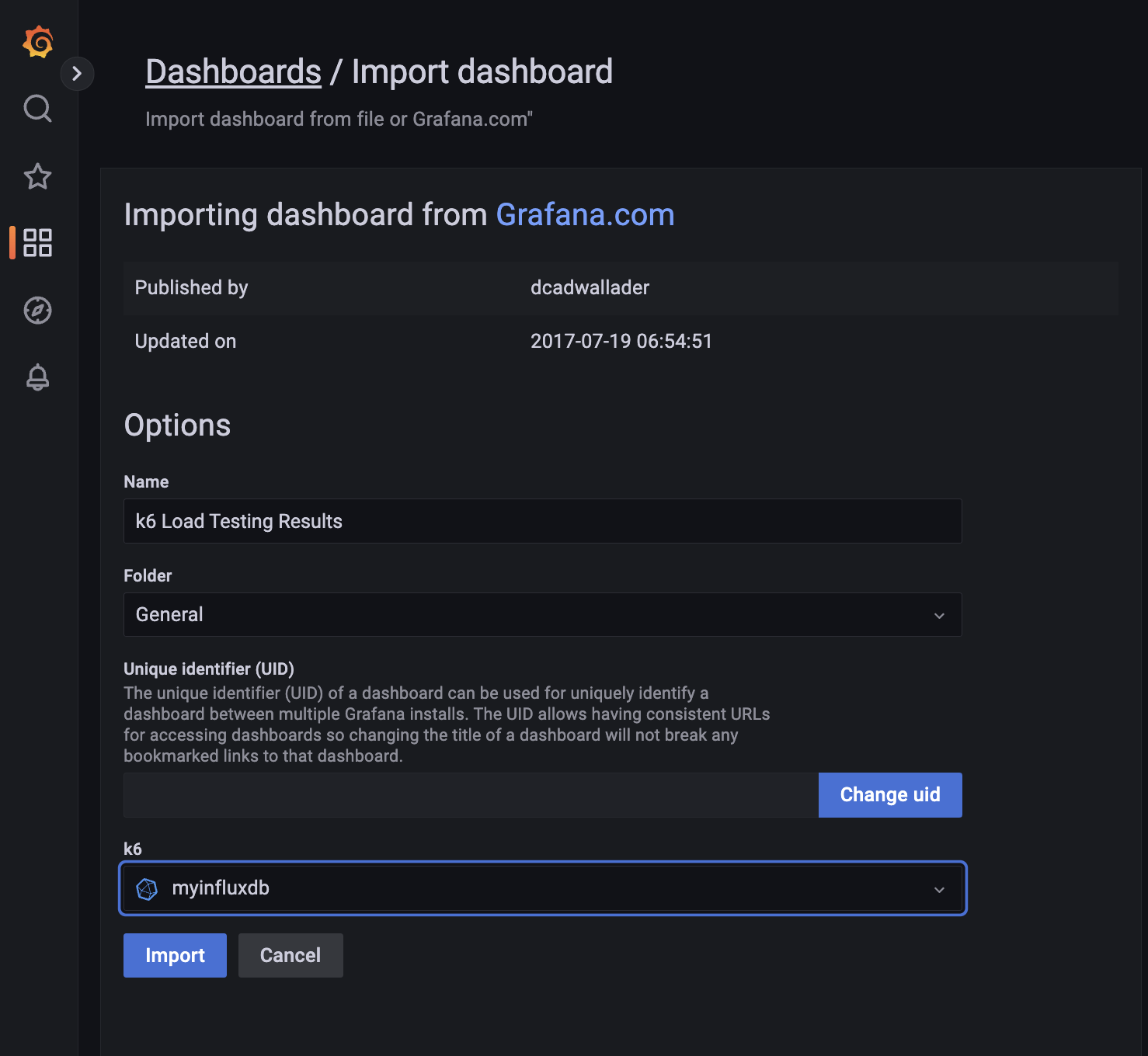 ㅇ influxdb를 선택하고 import를 클릭한다.