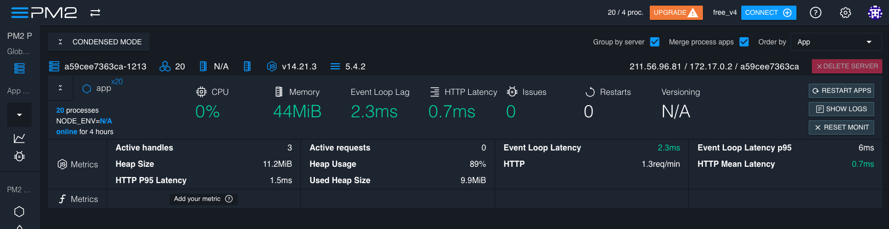 ㅇ pm2 monit으로 서버 지표 및 로그 확인 결과