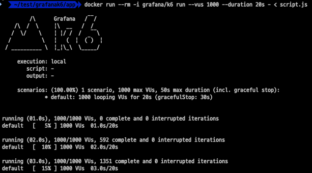 $ docker run --rm -i grafana/k6 run --vus 1000 --duration 20s - < script.js