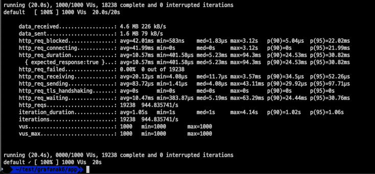 running (20.0s), 1000/1000 VUs, 18238 complete and 0 interrupted iterations