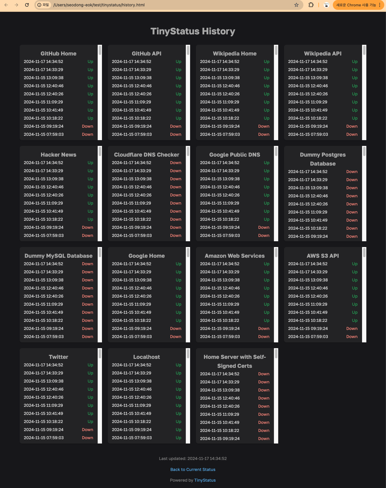 TinyStatus는 단일 HTML 파일로 구성된 경량 상태 페이지 생성기다.