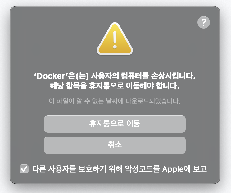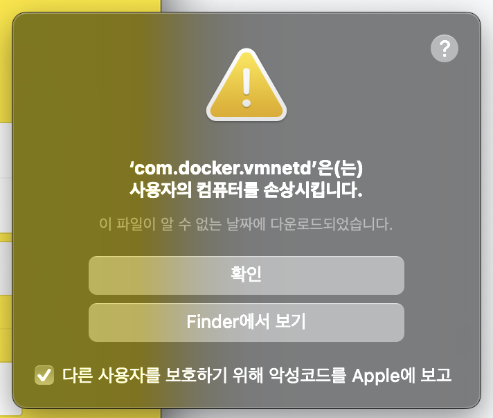ㅇ Docker가 자동업데이트되면서 다운로드한 파일이 MacOS 보안과 충돌이 발생하였다.