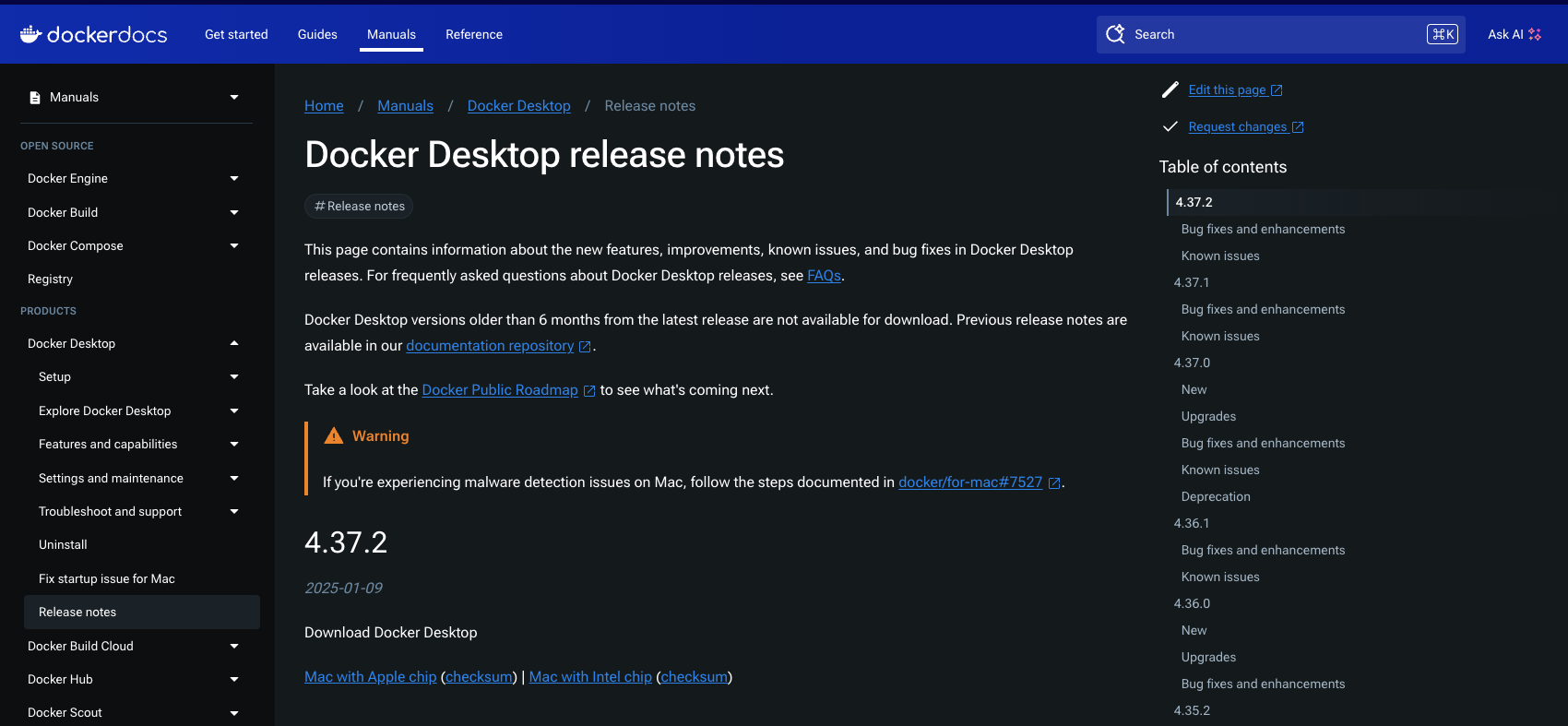 ㅇ Docker Desktop release notes에 다음과 같은 경고가 있다.