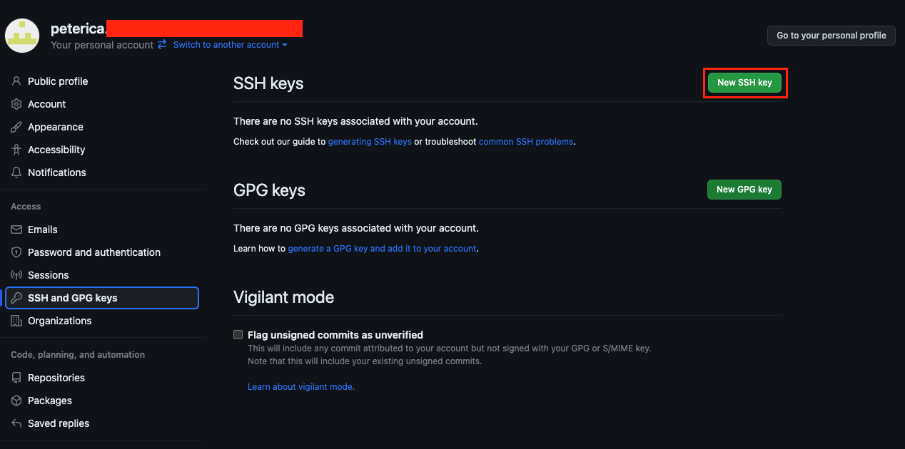 ㅇ Settings > SSH and GPG keys로 이동하고 "New SSH key" 버튼을 클릭한다.