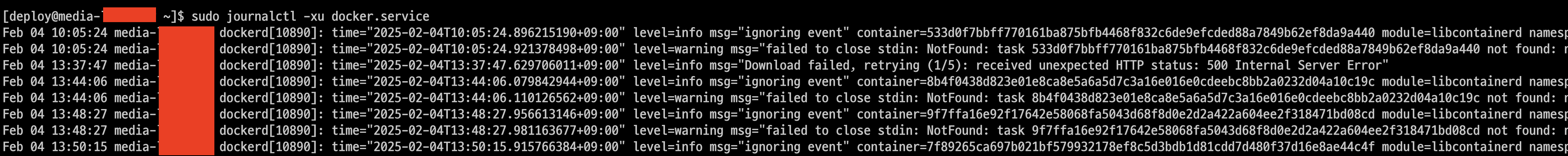 젠킨스 빌드 중 Docker 컨테이너가 먹통이 되어서 원인을 찾고 있었다. docker logs, stop, rm -f, kill 명령어를 사용하였지만, 아무것도 통하지 않았다. 이런 경우 Docker 데몬 자체의 문제이기 때문에 데몬의 로그를 확인하여 Docker 시스템 전반의 문제을 파악하야 한다. Docker 데몬 로그를 확인하는 방법은 운영 체제와 설정에 따라 다르다.