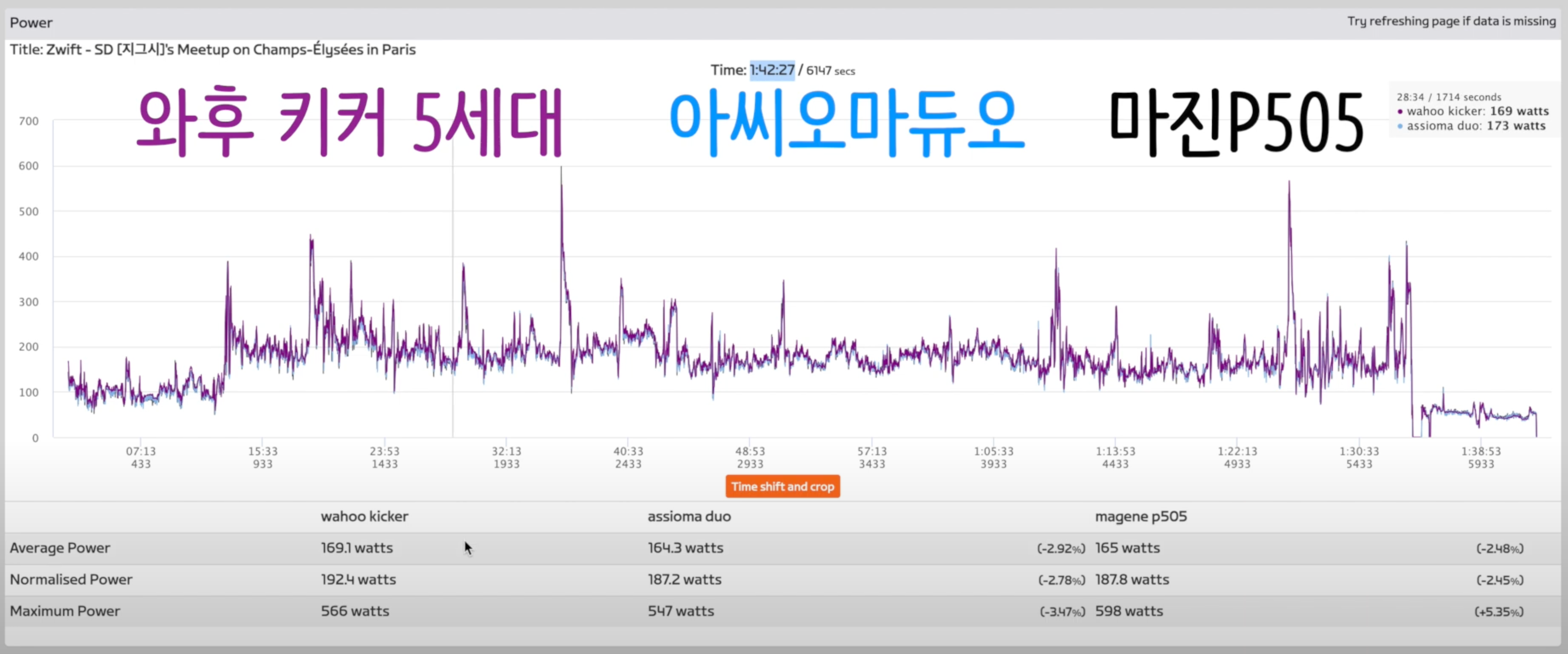ㅇ 파워미터 고민 중이라면 이거 한번 보고 결정하세요! 유튜브 동영상의 한 캡쳐인데, 정확한 파워를 측정하고 있다.
