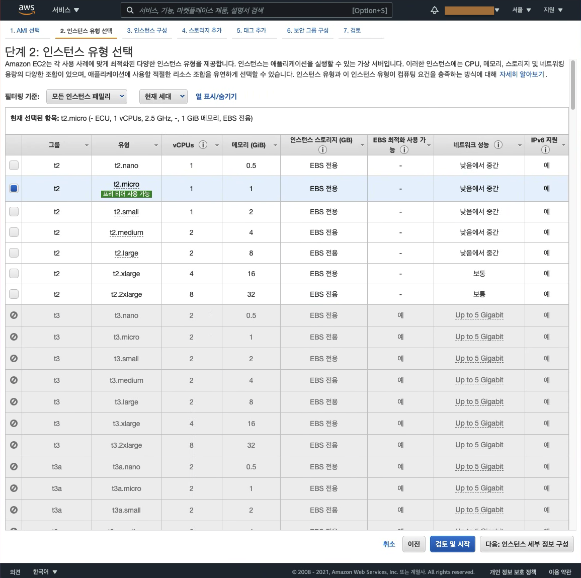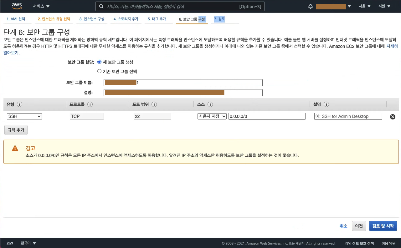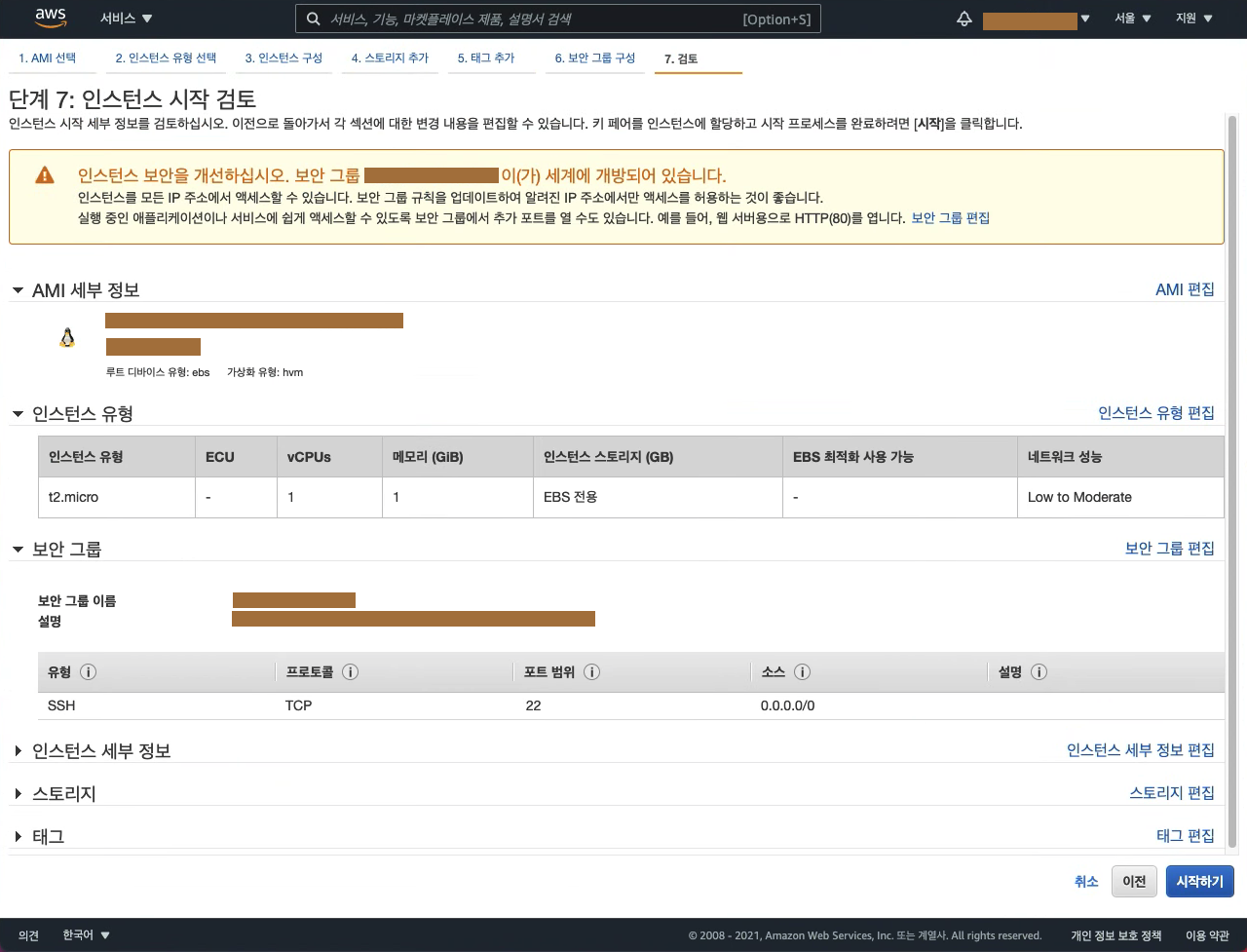 지금까지 설정한 내용의 섬머리입니다. 보안그룹을 특별하게 세팅하지 않았기 때문에 방화벽은 오픈된 상태여서 경고가 있습니다. 인스턴스 생성 후에 네트워크 보안그룹을 지정할 수 있습니다.