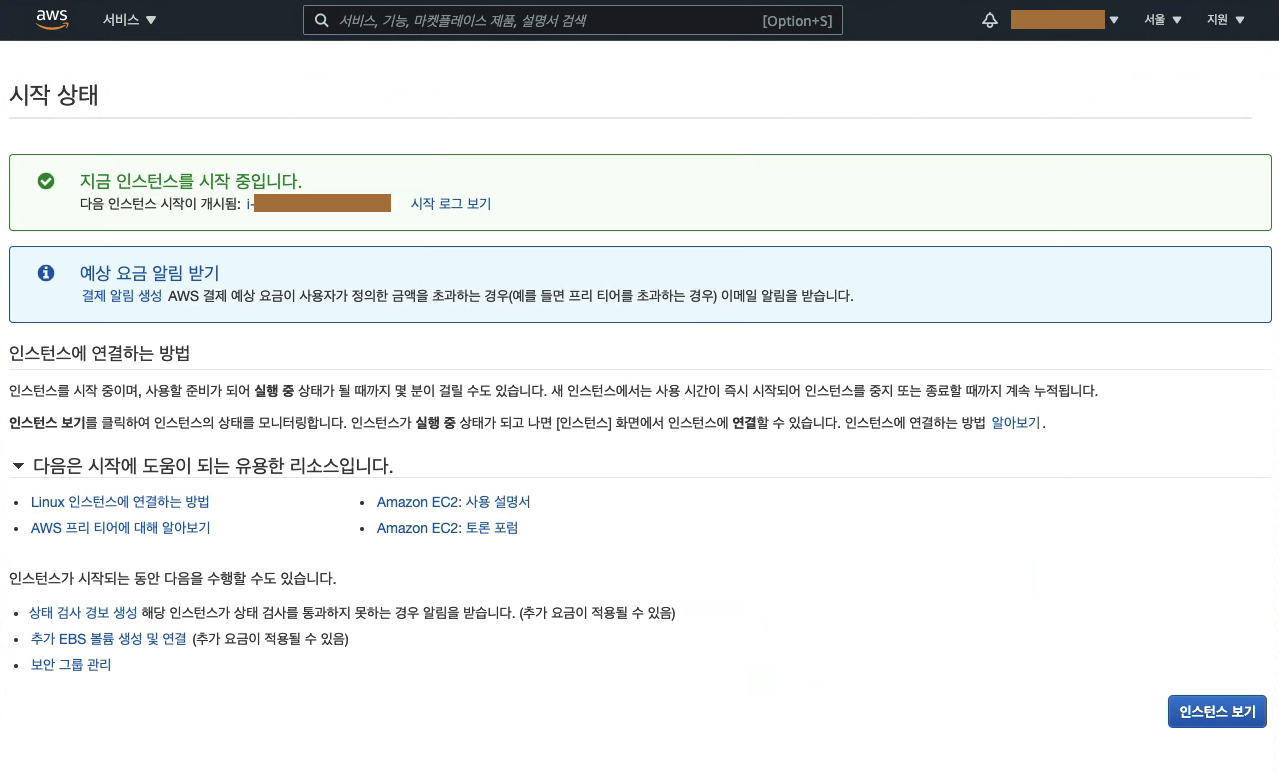 인스턴스를 시작합니다. 소요시간은 1분정도 걸렸습니다.